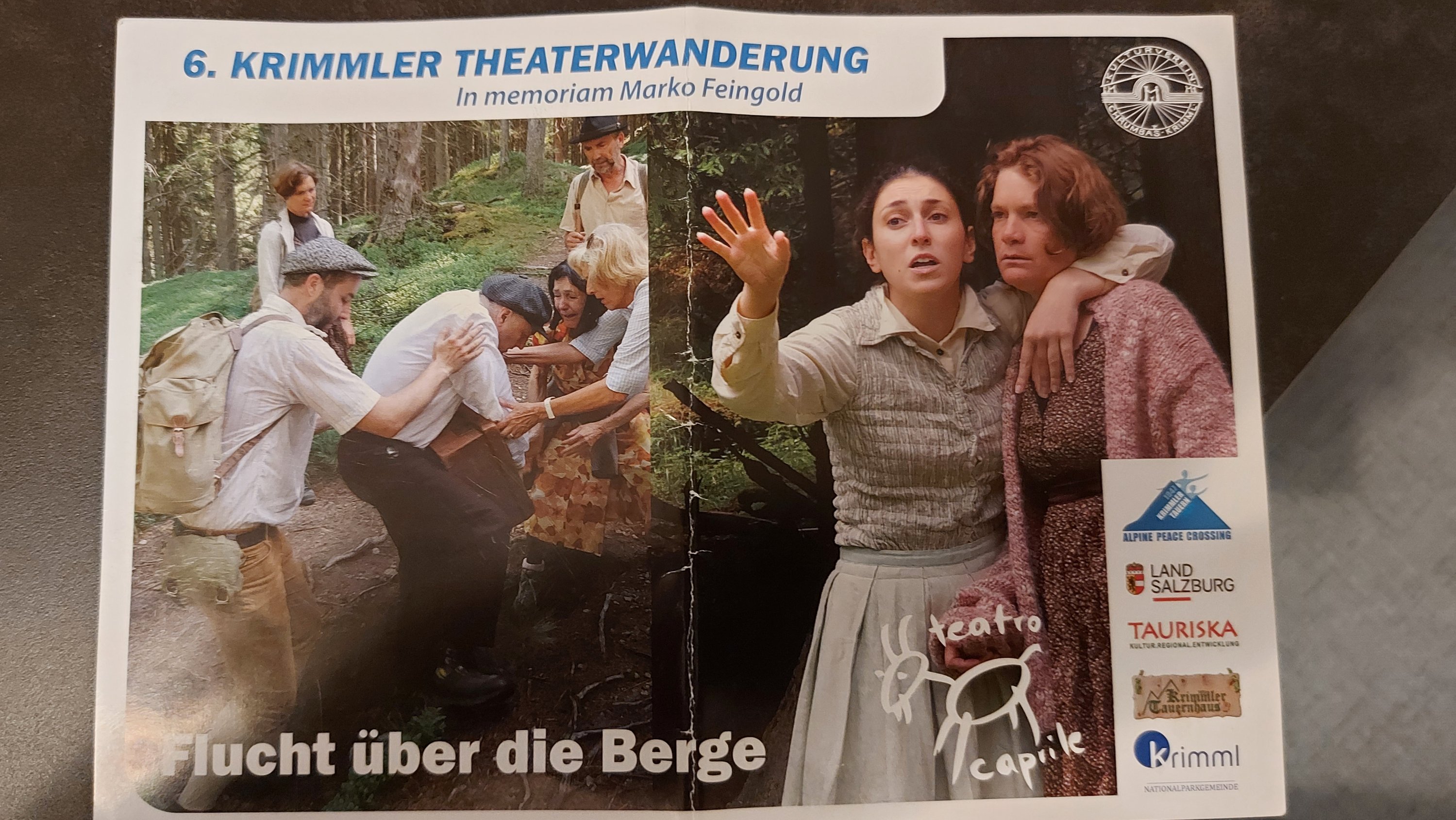 Die Theaterwanderung startet um 9.00 Uhr beim Musikpavillon in Krimml. 27 Wanderlustige finden sich ein und wandern gemeinsam mit den Schauspielern zuerst entlang des alten Tauernweges den Wasserfällen entlang. Am Weg sehen wir Szenen zur Flucht der Juden im Jahr 1947 über den Krimmler Tauern nach Italien. Das Wandertaxi bringt uns dann zum Tauernhaus und später bis zur Abzweigung, wo es dann zu Fuß weiter bis zur Windbach Alm geht. An unterschiedlichen Stellen werden weitere Szenen gespielt und Hans erzählt uns viel Interessantes über einen Teil der Geschichte, von dem ich bislang nichts wusste. Sehr beeindruckend und berührend.