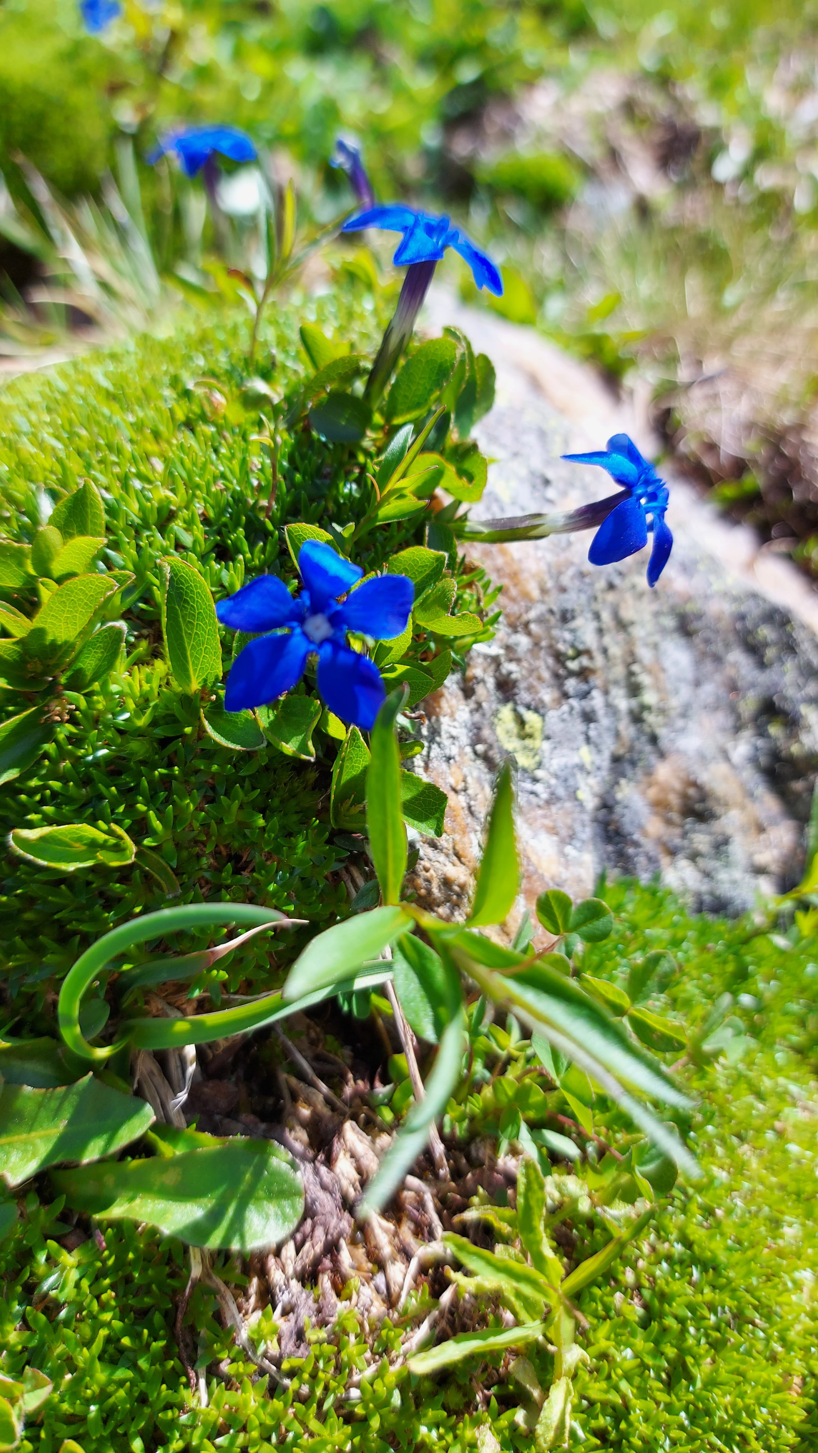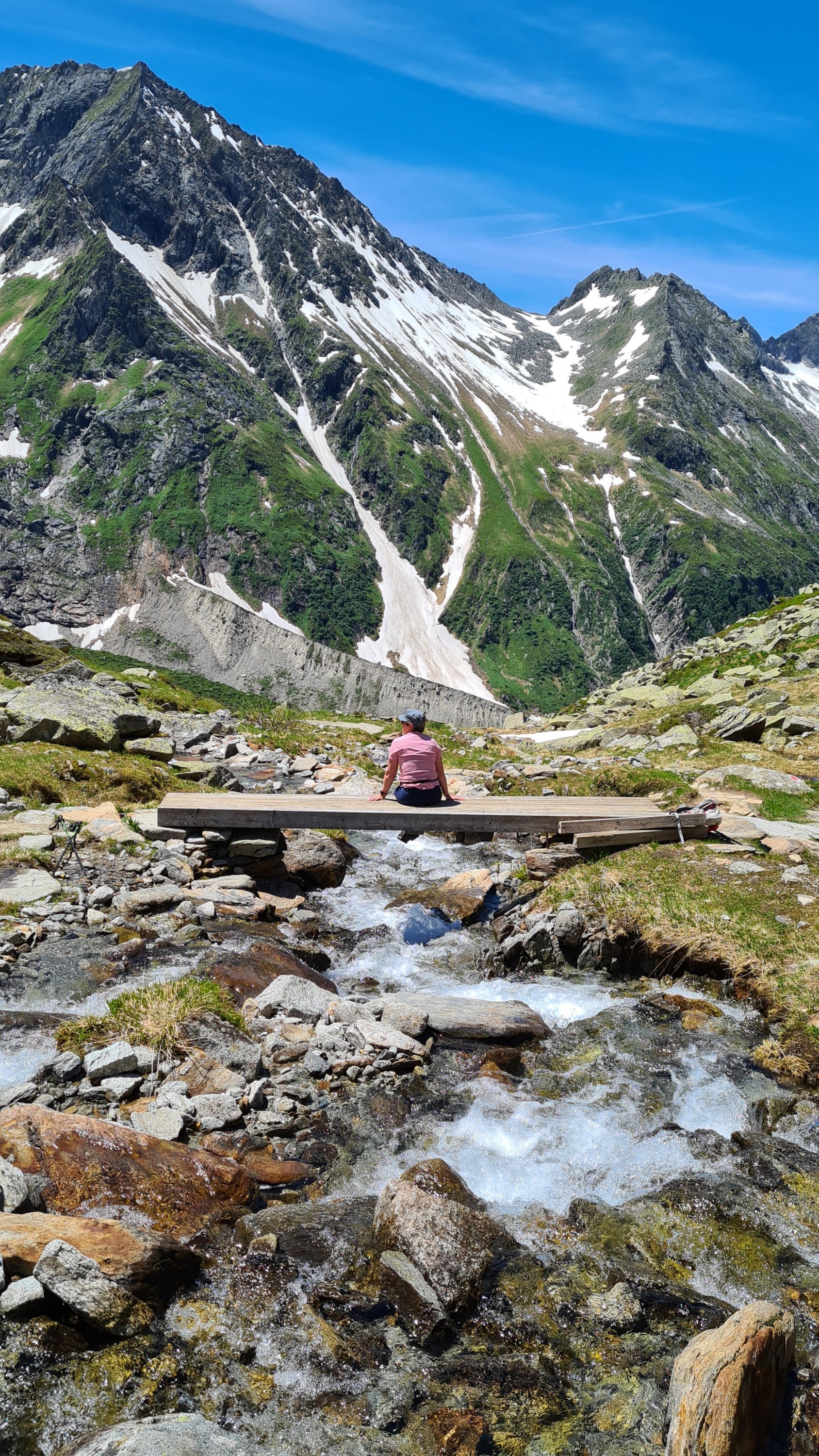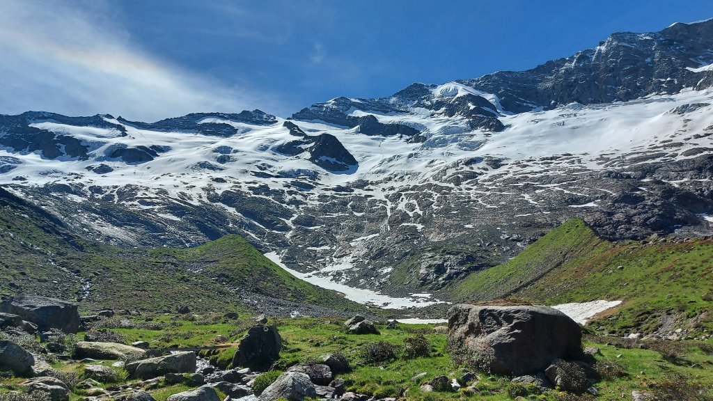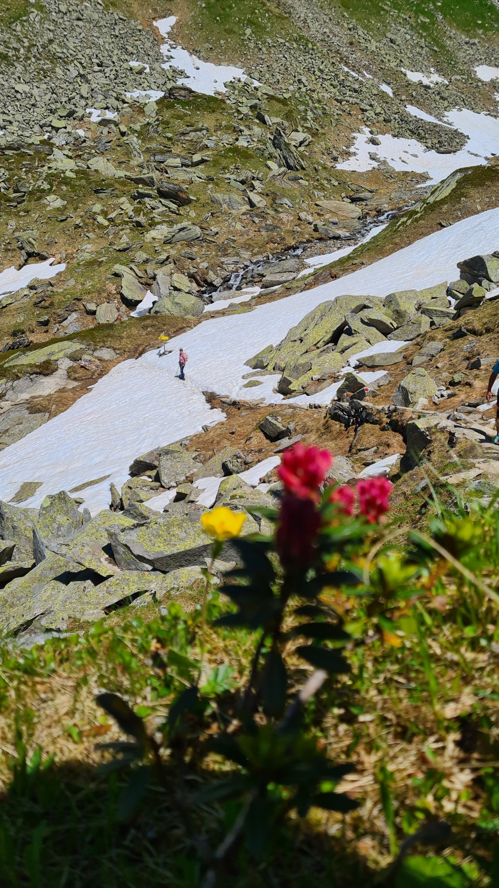Von dort geht es dann zu Fuß über Stock und Stein, über schmale steile Wege hinauf auf 2340 m. Das Wetter ist traumhaft. Der Gletscher leuchtet im Sonnenlicht. Zwischen noch blühendem Almrausch und Enzian geht es stetig bergauf. Nach der ersten Steigung geht es zum Durchschnaufen ein Stück flach dahin. Dort liegt noch Schnee und die Hütte ist in Sicht, doch noch trennen uns 300 Höhenmeter.