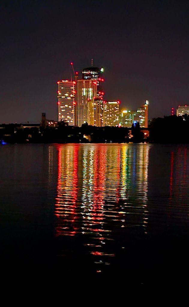 Nachts an der Alten Donau sind auch alle Katzen grau, aber bei bunter Kulisse.