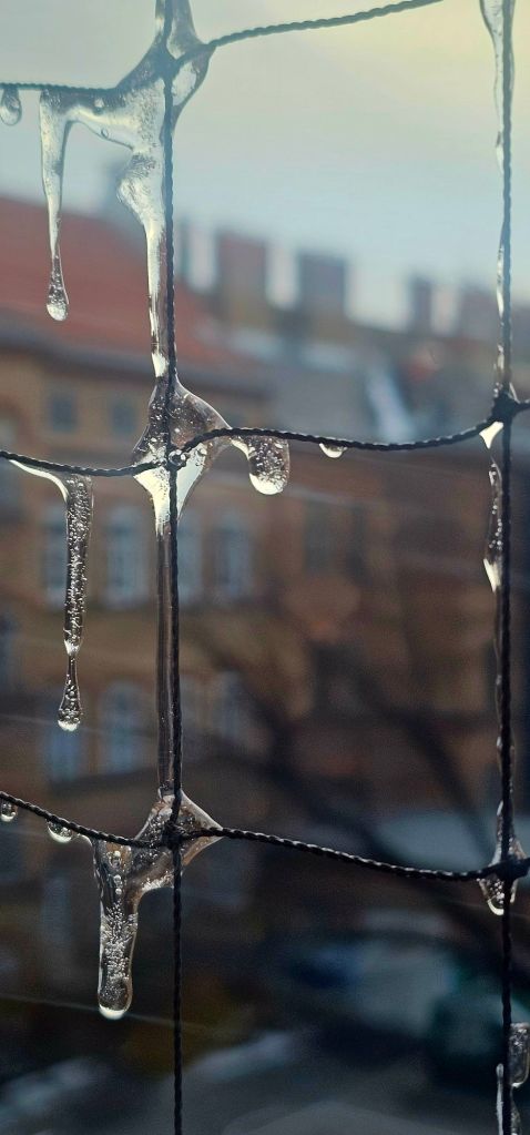 Wenn die Wassertropfen frieren, wirkt sogar das Taubenschutznetz schön und glitzert in der Sonne 🌞.